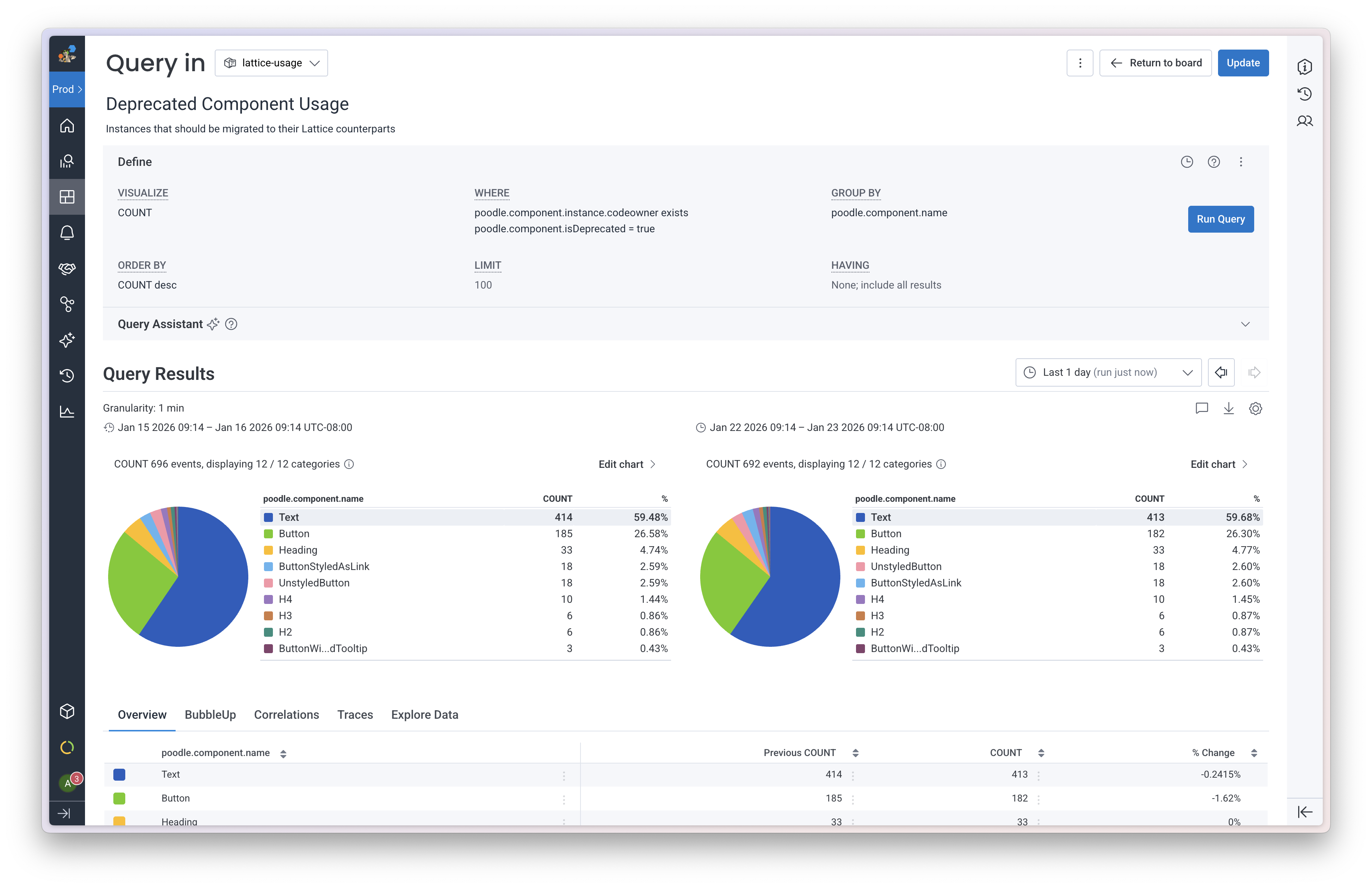Now for the payoff: turning this data into actionable insights. Once the data landed in Honeycomb, I set up queries to track deprecated component usage along with design system component usage: